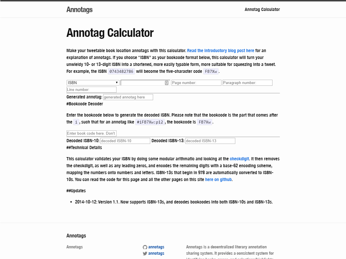 Annotags is a decentralized textual annotation protocol that encodes bibliographic data into a microbloggable textual location hashtag. Related open-source software projects include a web app that transforms ISBNs and other identifiers into hashtags, and a bookmark let that produces hashtags from ebooks and WorldCat entries. A mobile app is in development. Using Annotags, scholars may have discussions in the virtual margins of a text, and literature students may tweet their responses to assigned readings.