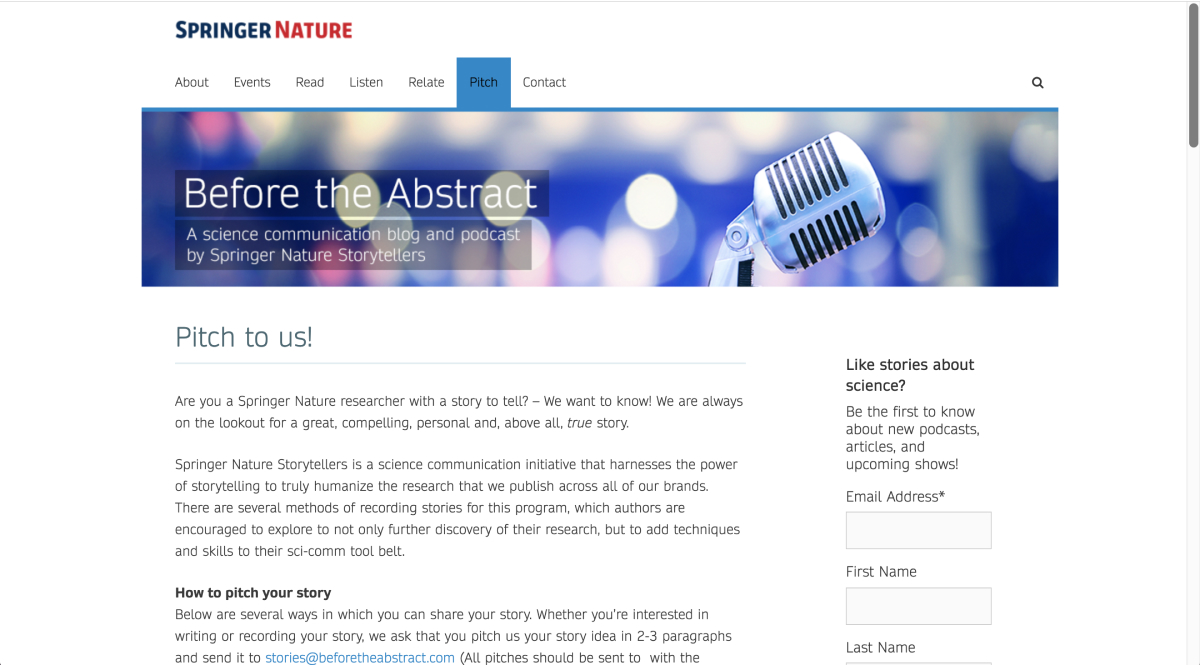Before the Abstract, bringing you the real-life stories from researchers on the front lines of discovery. Springer Nature Storytellers and the Before the Abstract website are both part of an endeavour by Springer Nature to highlight the importance and utility of storytelling in science. As the need to communicate research beyond the confines of scholarly circles grows, Springer Nature is offering authors and potential authors the opportunity to talk about their real-life experiences as researchers, in their own words. We feature these personal stories through a mix of podcasts recorded at live events and written submissions, as well as a section featuring discussions on storytelling in scientific communications and tips on how to craft a narrative.