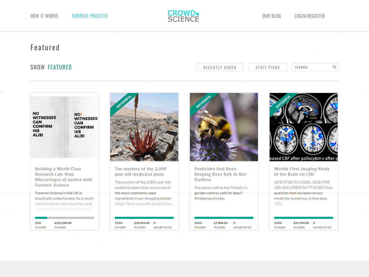 Crowd.Science (formerly Walacea.com) is a crowdfunding platform dedicated to science. In the UK, there is £10 billion of research that is not funded; not because of quality, but because of a lack of funds. To date, over £750k has been pledged to projects on Crowd.Science from 3.4k members of the public, 12 businesses, and one philanthropist. They host a broad range of projects that appeal to different audiences, ranging from rare diseases, conservation, forensic science, to more. The only rule is that science must benefit society in some way. They offer the public, corporates, and major donors the opportunity to fund the scientific research that people care about such as health and environment-related topics.