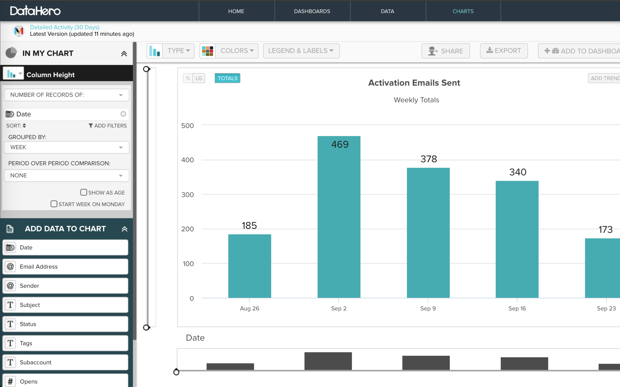Use drag-and-drop chart creation to generate insightful, intuitive, and great looking data visualizations in minutes. Custom tailor to your brand guidelines and color schemes. No coding or querying languages required.