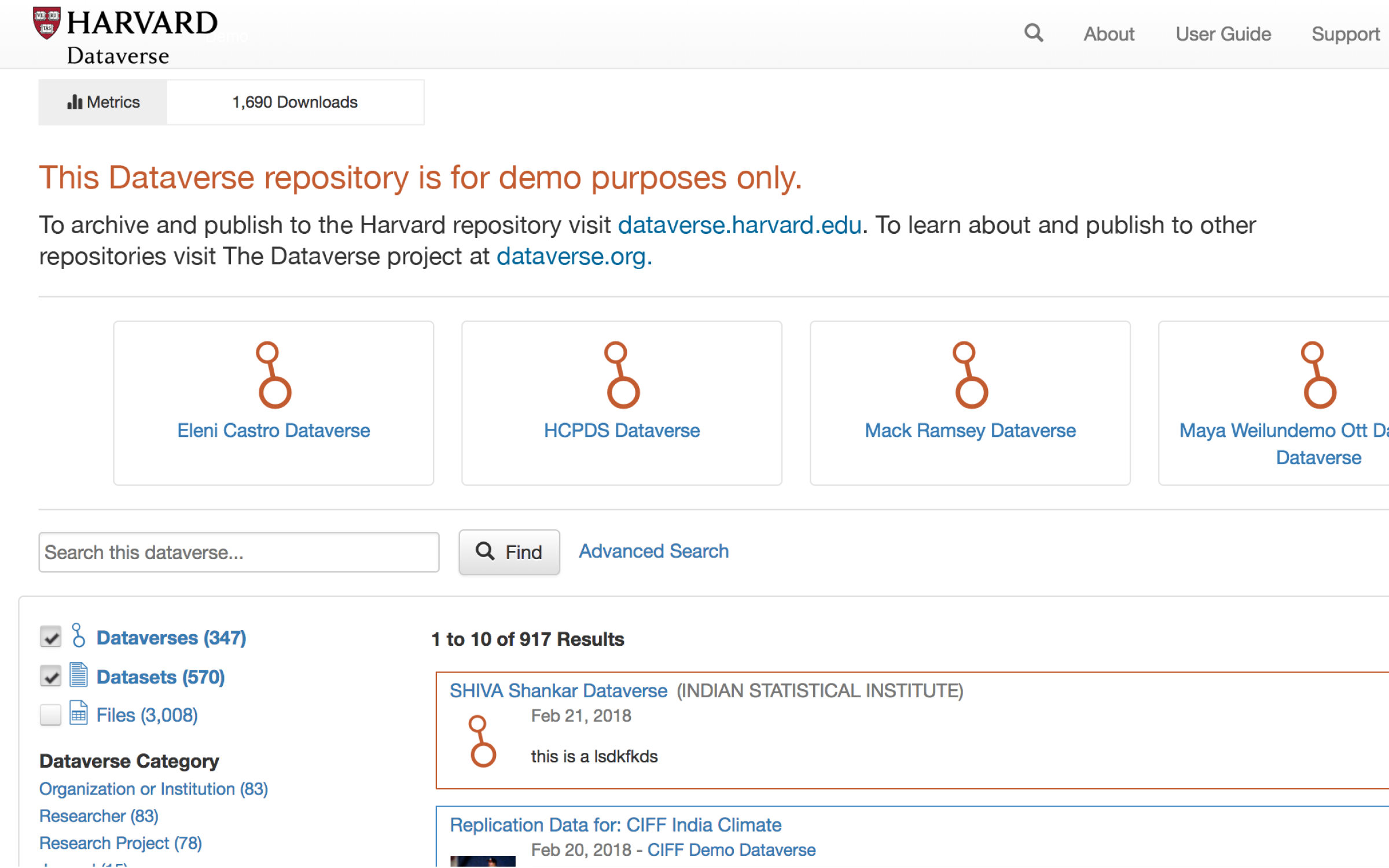 Enjoy full control over your data. Receive web visibility, academic credit, and increased citation counts. A personal dataverse is easy to set up, allows you to display your data on your personal website, can be branded uniquely as your research program, makes your data more discoverable to the research community, and satisfies data management plans.