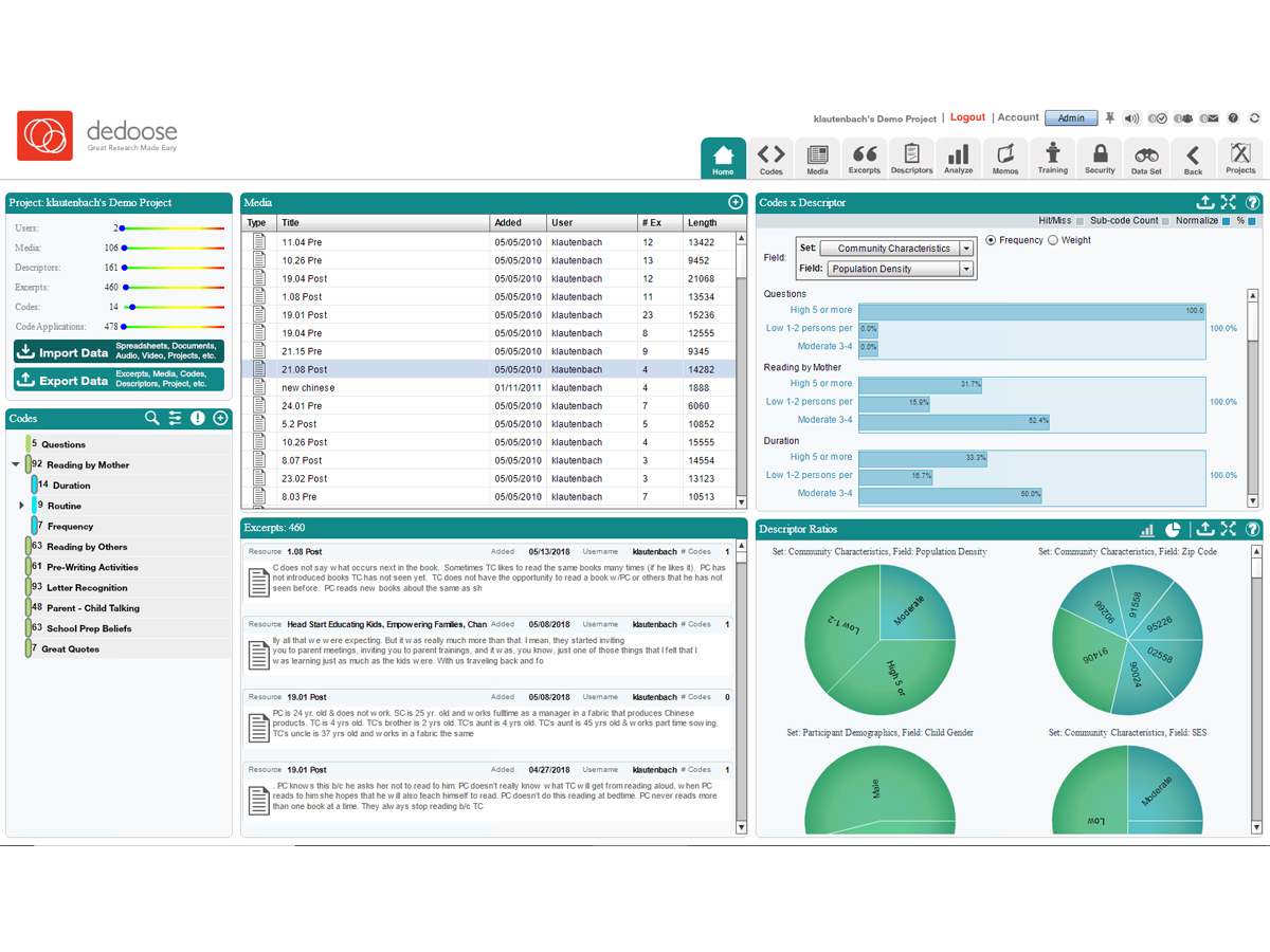Dedoose is a cloud-based collaboration platform for researchers in a variety of industries including the sciences, teachers, students, data analysts and more. It offers communication tools, file management, and task assignment. It allows users to analyze qualitative and mixed-methods research with text, photos, audio, videos, spreadsheet data and more. Users can create and modify “codes” to tag various stages of their methodology and organize research procedures. Users can begin projects based on existing data sets or create projects directly. An integrated chat feature and memos enable users to communicate with one another in real-time. Access groups can be established to specify permissions settings for groups of users, which determines which data they may view and modify.