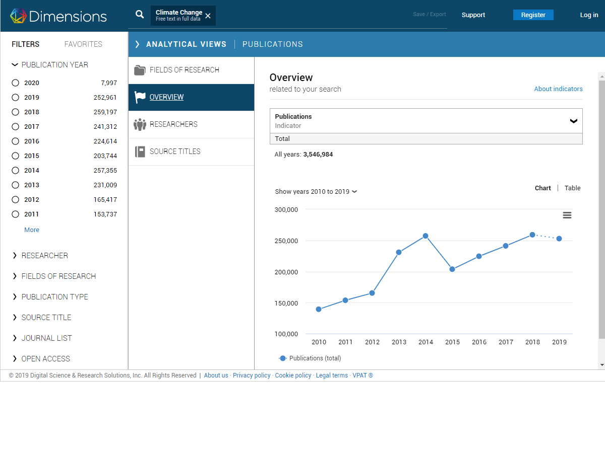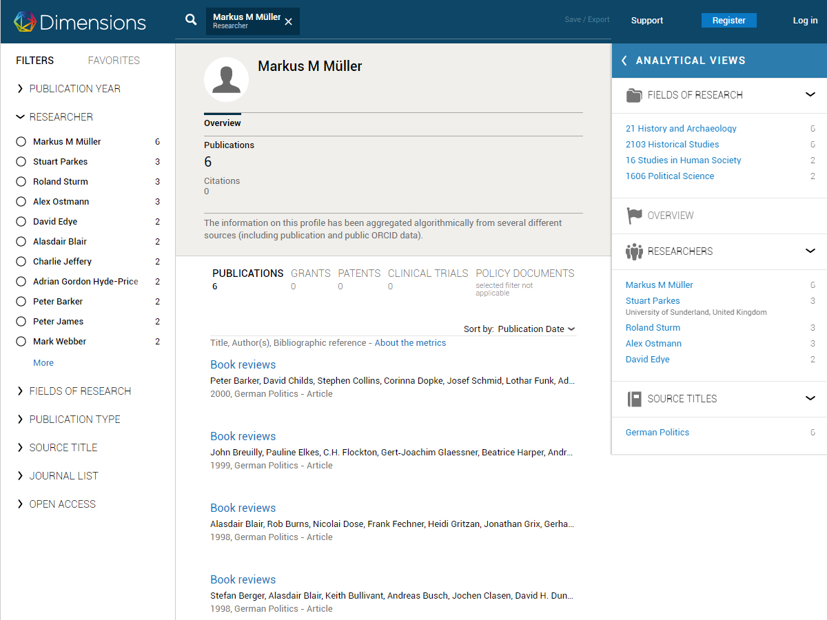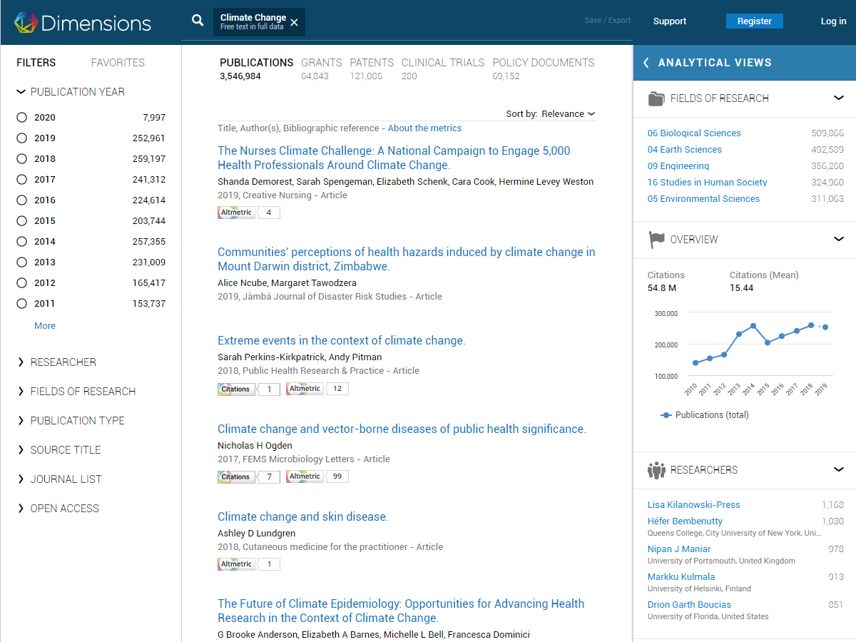 With Dimensions, you can search across multiple content types, ranging from publications to grants, clinical trials, patents, and policy documents. The linking of all these data enables you to view the items returned in context, gain new insights from complex analytics, and trace the relationships between your results; for example, review the funders or grants behind a publication, or identify where published research led to a patent or a mention in a policy document.