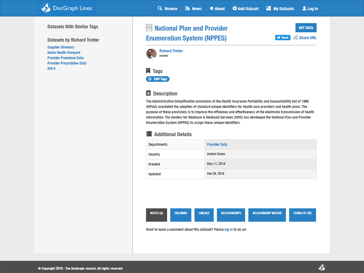 DocGraph Linea provides data scientists a socially-enabled community open data platform that collects details about disparate healthcare datasets, and further allows the community to extend what data is available. Users can search datasets, understand data lineage, view relationship matrices, add metadata, and see community algorithms.