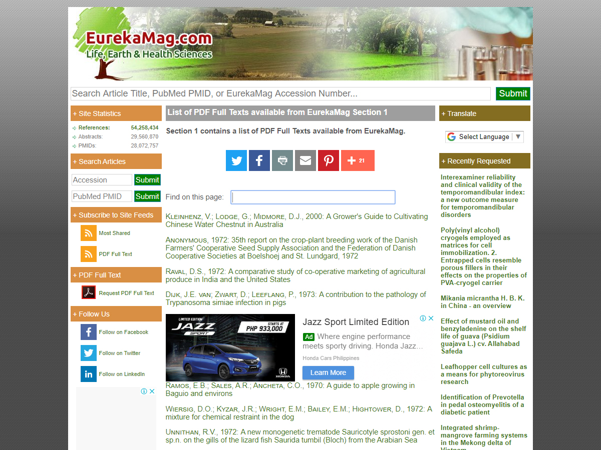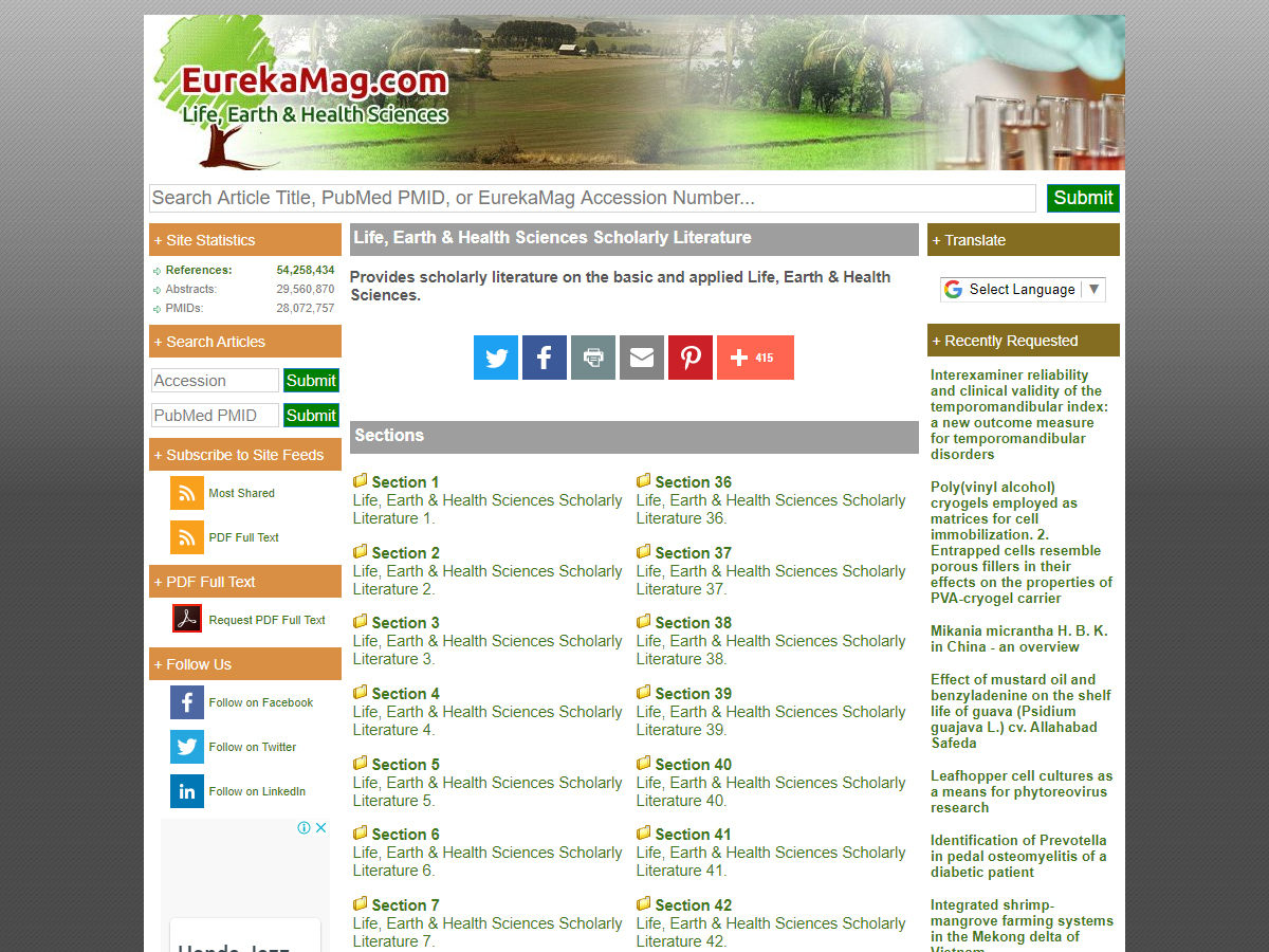 Covering life, earth, and health science scholarly literature, the site contains 52+ million articles, 30 million abstracts, and over 2 million PDF full texts. It was launched in November 1998, covering biology, applied life sciences, agriculture, horticulture and forestry, earth, environmental, and medical sciences. It features many disciplines of biology. Horticultural topics cover the cultivation and production of primary and secondary fruit and vegetable species, whereas other subjects include information on numerous aspects of agriculture and forestry. Other science disciplines covered on this site are the environmental sciences, including biodiversity and global warming, as well as health sciences.