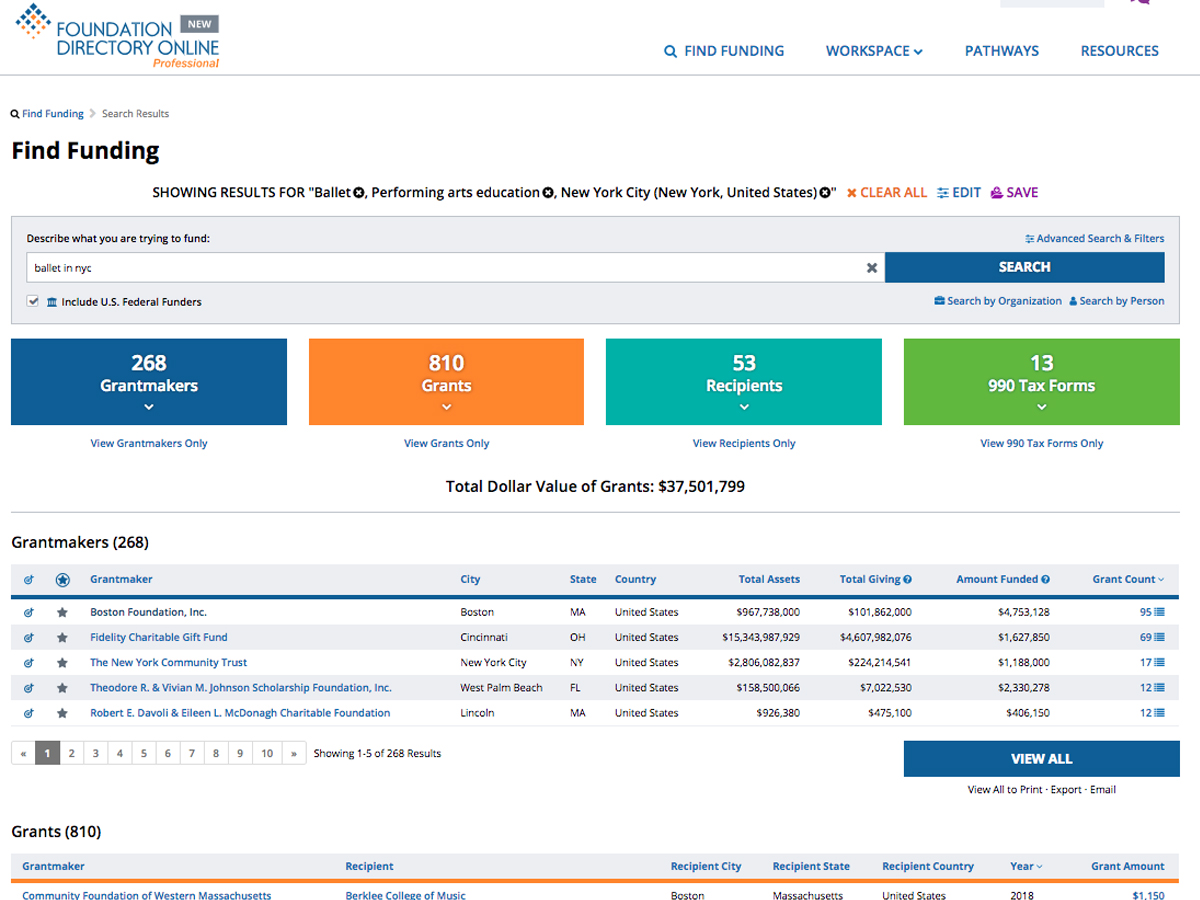 The Foundation Directory Online includes a searchable database of more than 2.4 million recently awarded grants plus a database of recently filed IRS 990 forms. Grantmakers and grants are searchable by name, geographic region, fields of interest, recipient type, support type, grant amount, and names of trustees and officers. It is a valuable resource for nonprofits’ fundraising needs, using interactive maps and charts, RFPs, and key funder and grants insights.