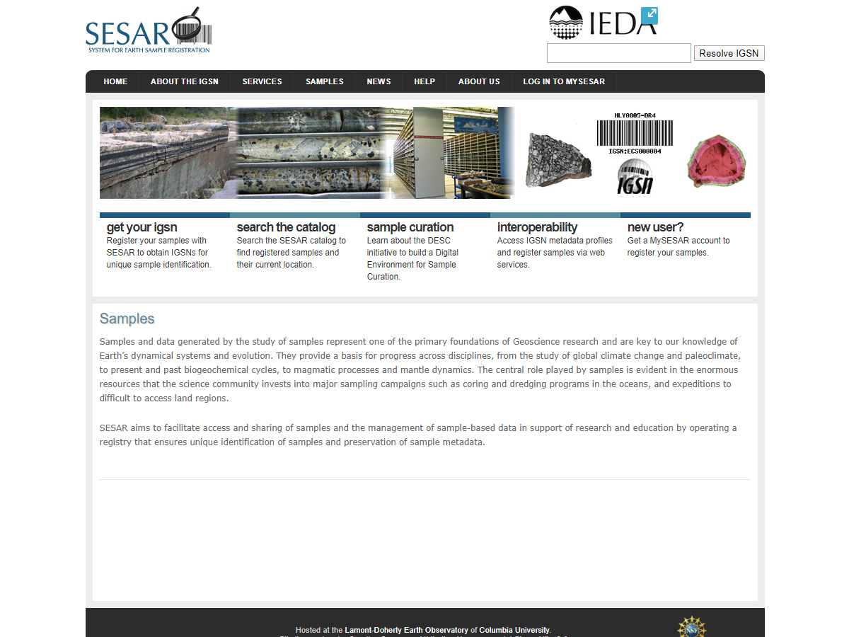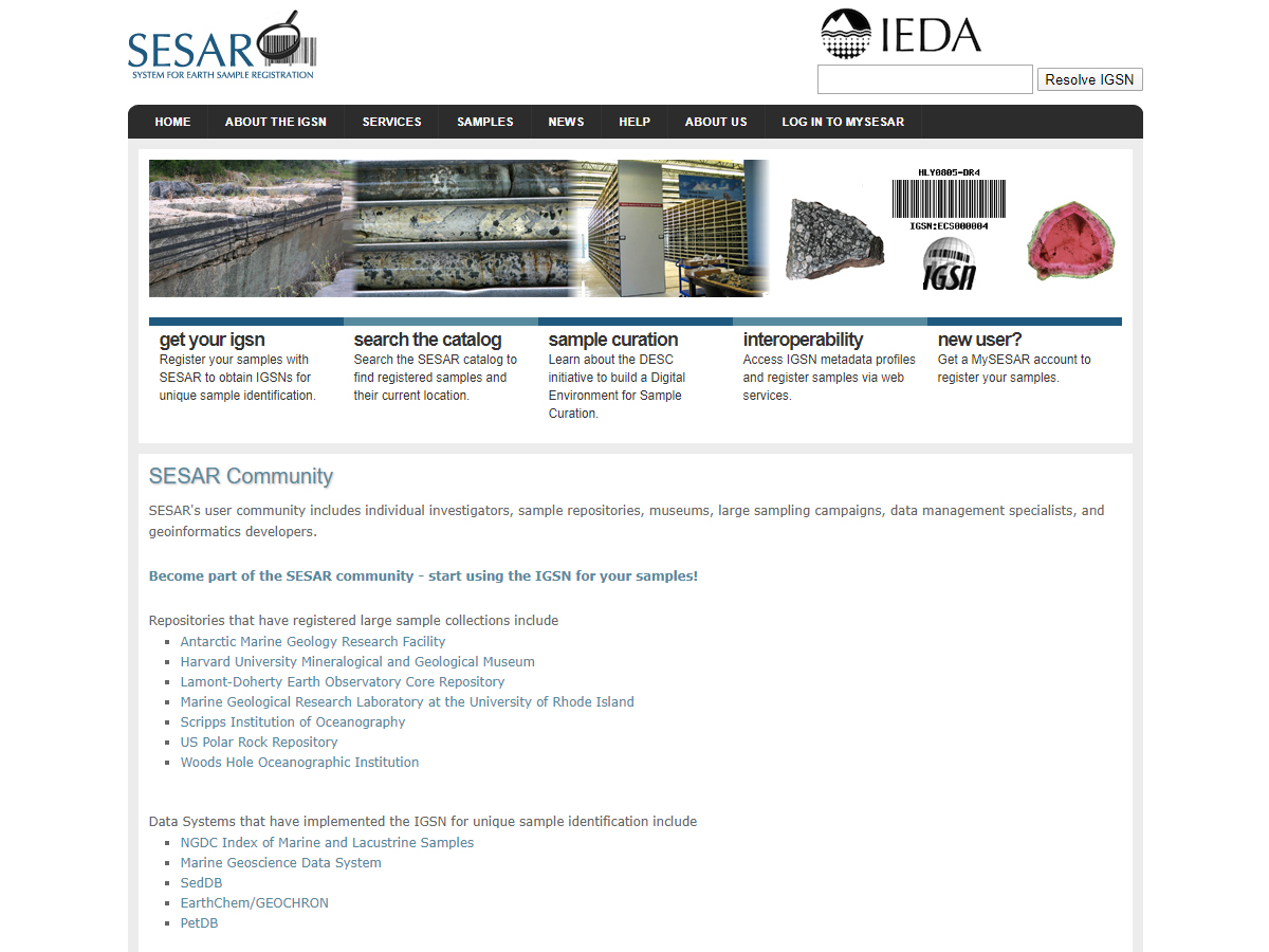 Geosamples (also known as SESAR) is a system for Earth sample registration that distributes the International Geo Sample Number IGSN. The System for Earth Sample Registration (SESAR) is a web-based registry that promotes sharing, linking, and integration of sample-based data by the assignment of IGSNs. The IGSN or International GeoSample Number is a 9-digit alphanumeric code that is assigned to specimens and related sampling features such as drill holes or wells to ensure their unique identification and unambiguous referencing of data generated by the study of samples. More than 4 million sites and samples have already been registered in SESAR.