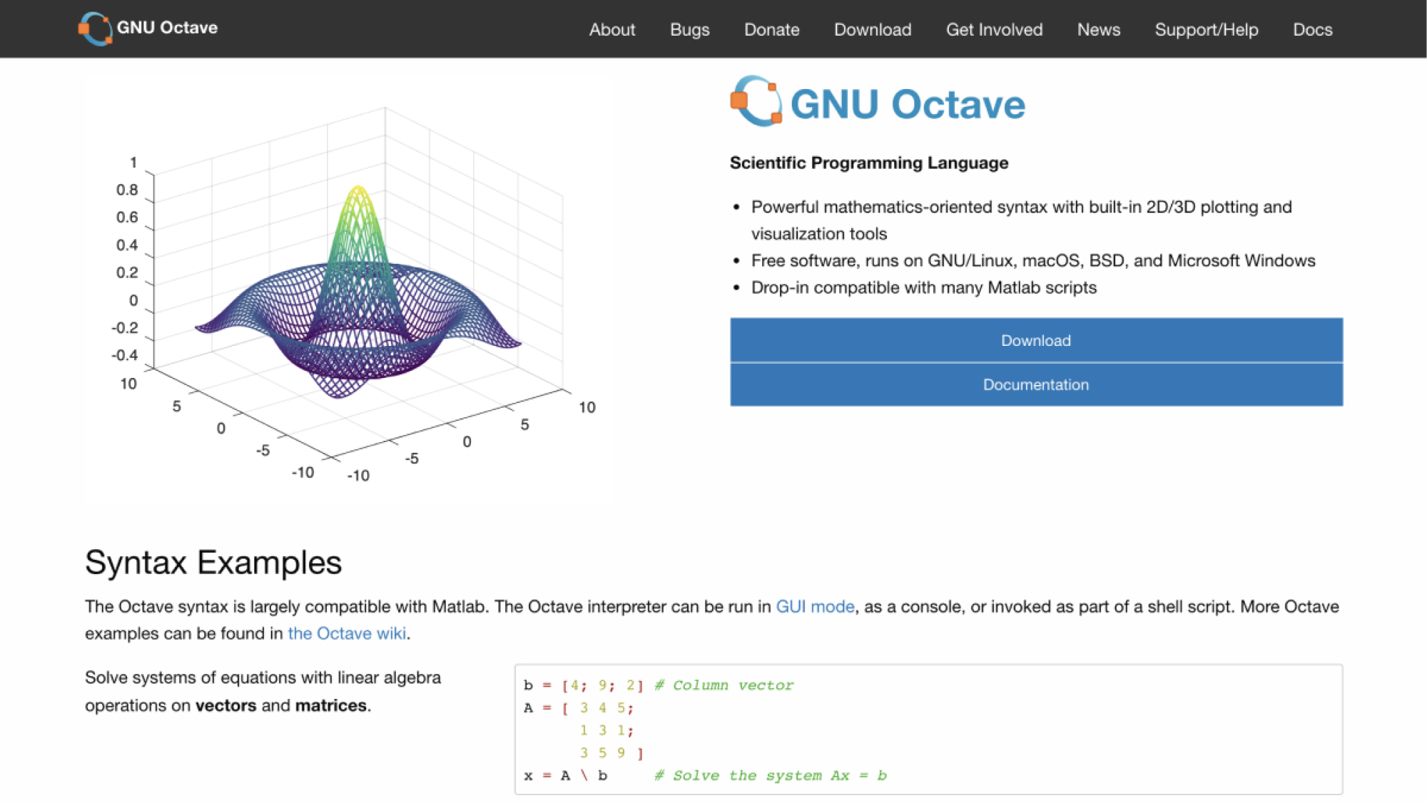 Octave provides a convenient command line interface for solving linear and nonlinear problems numerically, and for performing other numerical experiments using a language that is mostly compatible with MATLAB. It may also be used as a batch-oriented language. Octave has extensive tools for solving common numerical linear algebra problems, finding the roots of nonlinear equations, integrating ordinary functions, manipulating polynomials, and integrating ordinary differential and differential-algebraic equations. It is easily extensible and customizable via user-defined functions written in Octave’s own language, or using dynamically loaded modules written in C++, C, Fortran, or other languages.