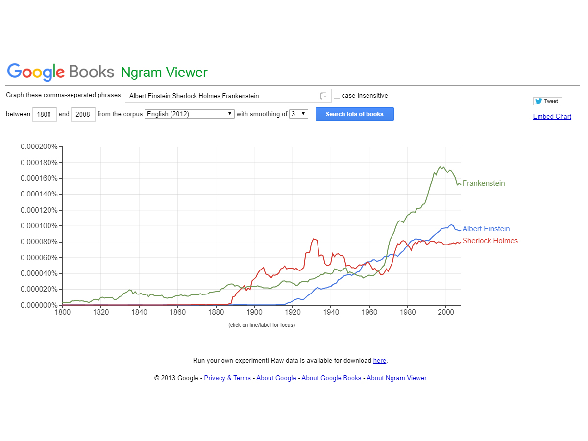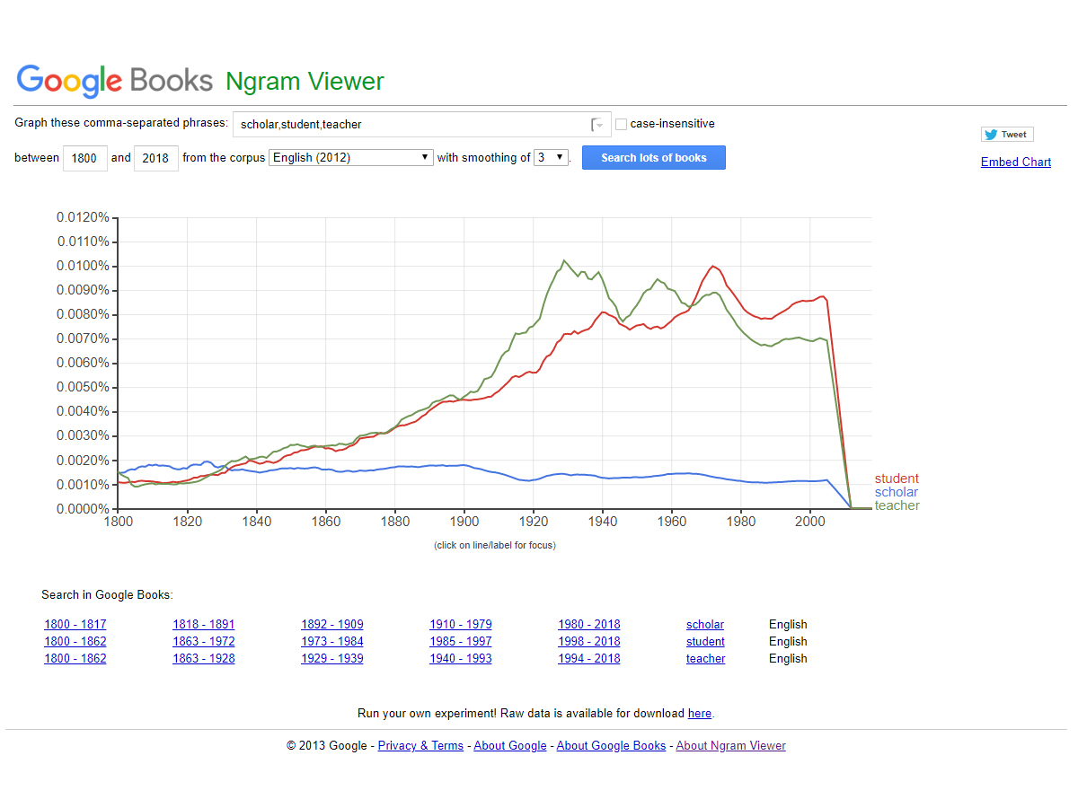 Google Ngram Viewer a search engine that lets users document the popularity of words and phrases over time. Developed by Google Books displays information through case sensitive phrases over a powerful collection of books, journals and other sources over selected years through varying frequencies.