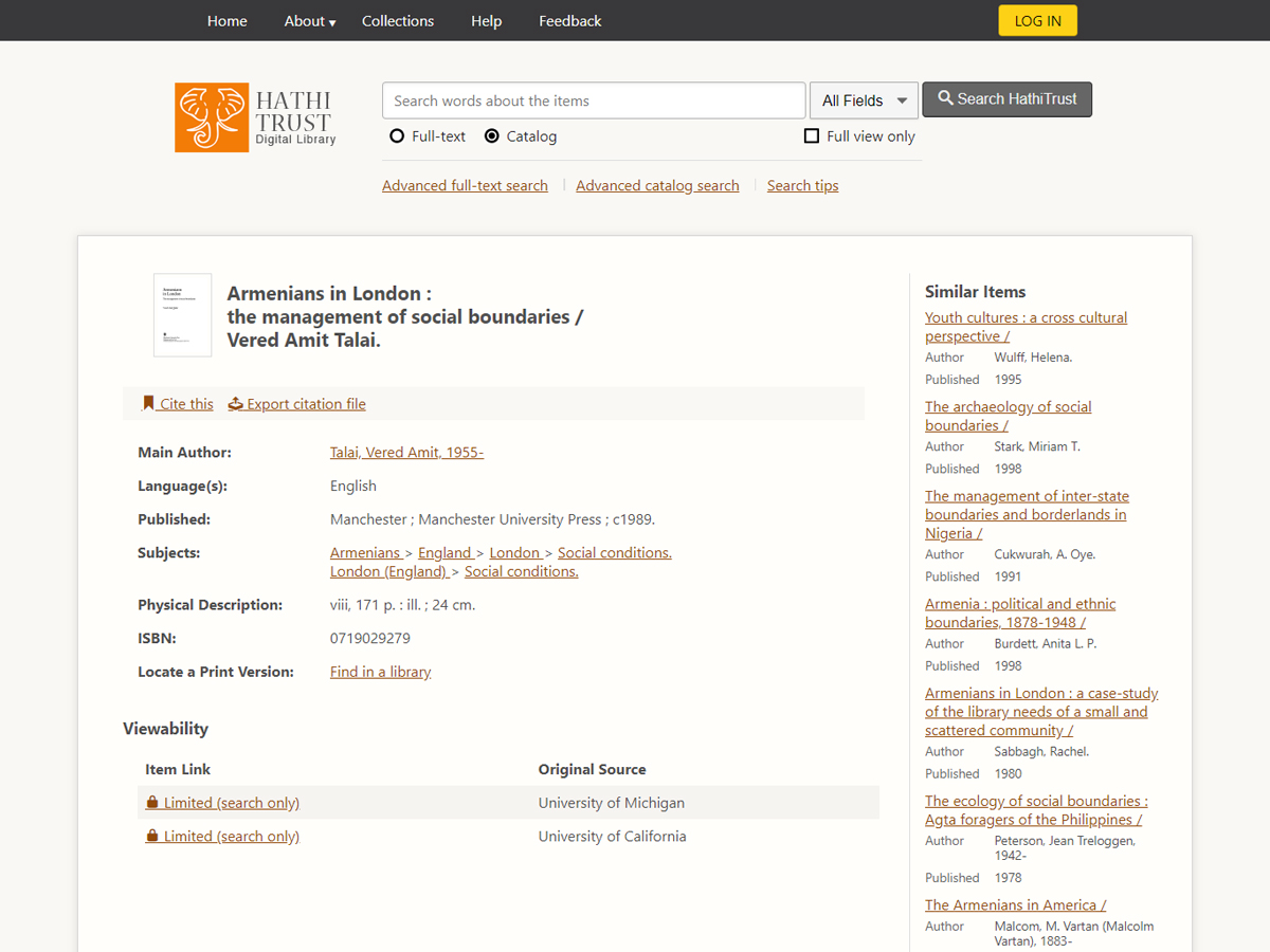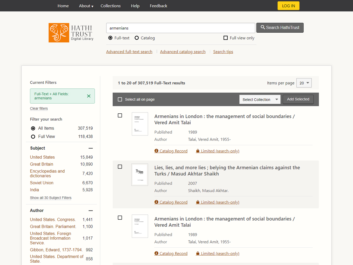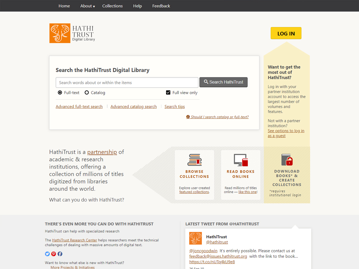 HathiTrust is a growing, global partnership of major research institutions and libraries, working to ensure that cultural records are preserved and accessible long into the future. The mission of HathiTrust is to contribute to research, scholarship, and the common good by collaboratively collecting, organizing, preserving, communicating, and sharing the record of human knowledge. There are more than 140 members in HathiTrust, and membership is open to institutions worldwide. All users may access the bibiliographic information for materials in the database. In addition, full text is viewable for "Full View" (public domain and open access) materials.