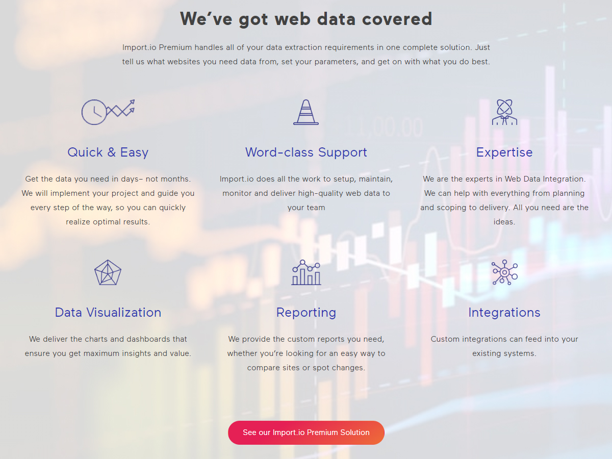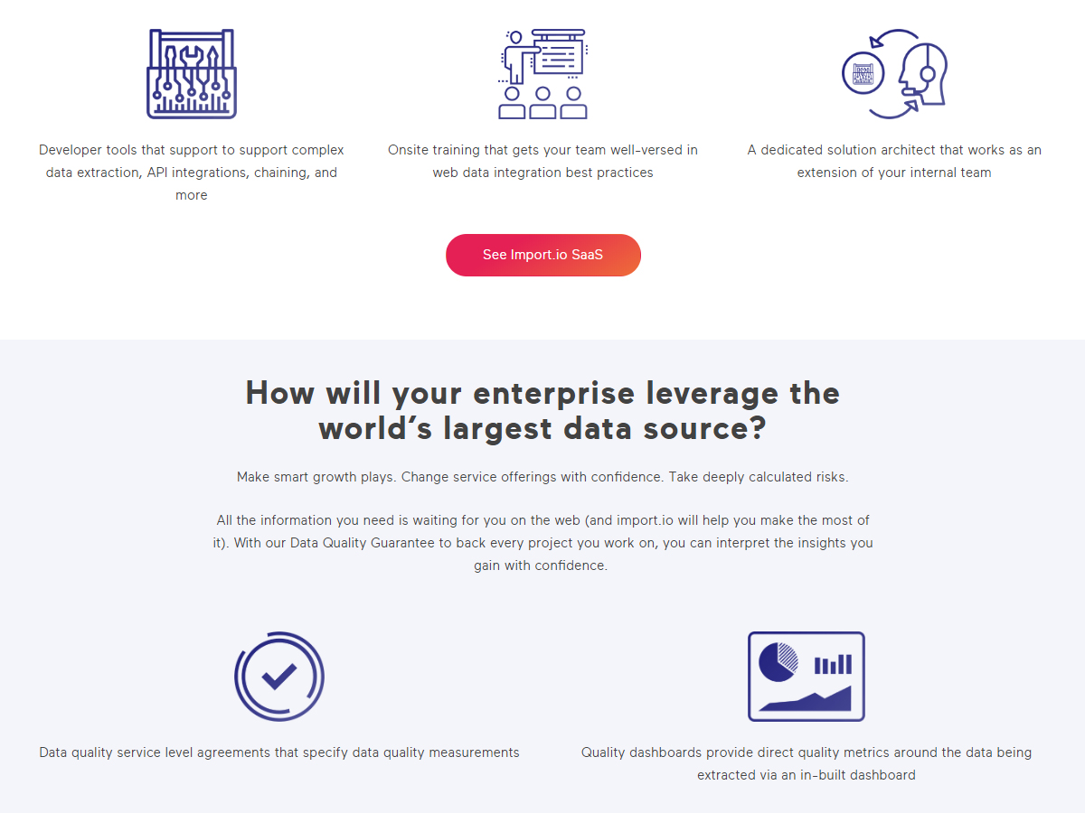 Import.io is a United Kingdom software company that was founded in 2012. It extracts web data and permits use it in all sorts of ways. Import.io returns data that can be used for price monitoring, lead generation, market research, app development, academic research or machine learning. It uses highly sophisticated machine learning algorithms to extract data automatically the first time. The tool offers a URL generator to find common patterns and generate thousands of URLs in seconds.