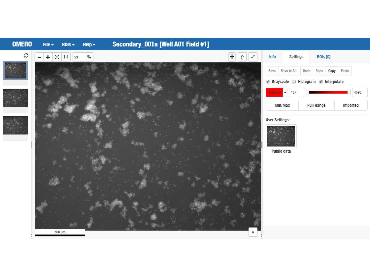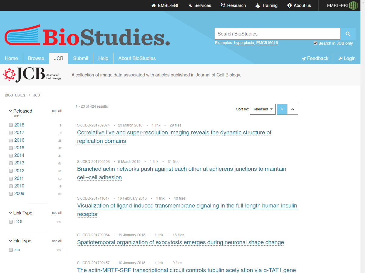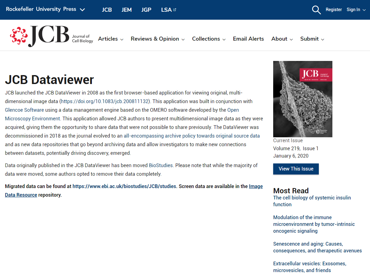 The JCB DataViewer is an image hosting and visualization platform for original microscopy image datasets associated with articles published in The Journal of Cell Biology, a peer-reviewed journal published by The Rockefeller University Press. The JCB DataViewer can host multidimensional fluorescence microscopy images, 3D tomogram data, very large (gigapixel) images, and high content imaging screens. Images are presented in an interactive viewer, and the "scores" from high content screens are presented in interactive graphs with data points linked to the relevant images. The JCB DataViewer uses the Bio-Formats library to read over 120 different imaging file formats and convert them to the OME-TIFF image data standard.