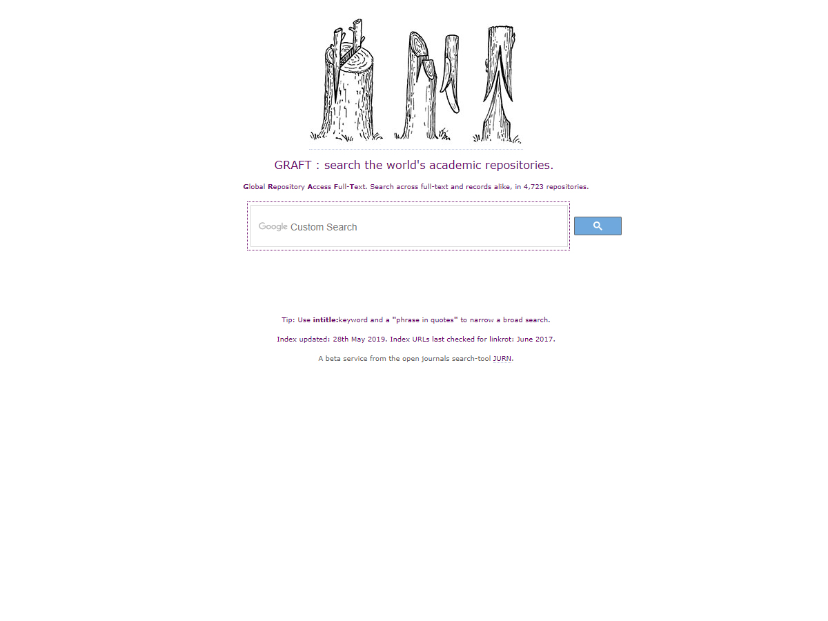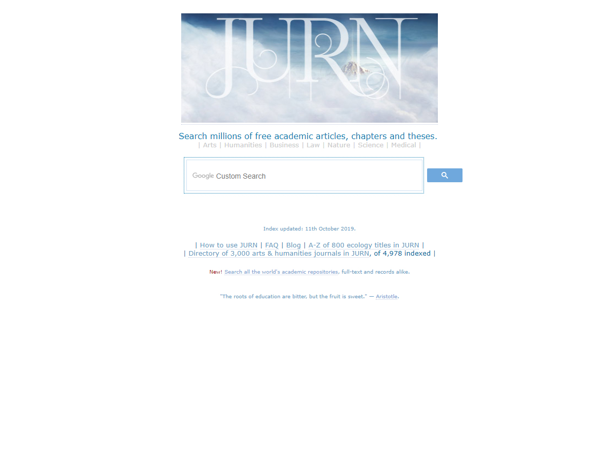 Jurn is a free online search tool for the finding and downloading of free full-text scholarly works. It was established in a public online open beta version in February 2009, initially for finding open access electronic journal articles in the arts and humanities. An additional public directory of web links to the indexed journals was placed online in mid 2009. The Jurn search service and directory has since been continually updated and cleaned. In March 2014 Jurn expanded to index topics in science, biomedicine, business, and economics, plus selected university repository services for open access deposit papers and full-text theses. Jurn is powered by a Google Custom Search Engine (CSE) and is run without any adverts.