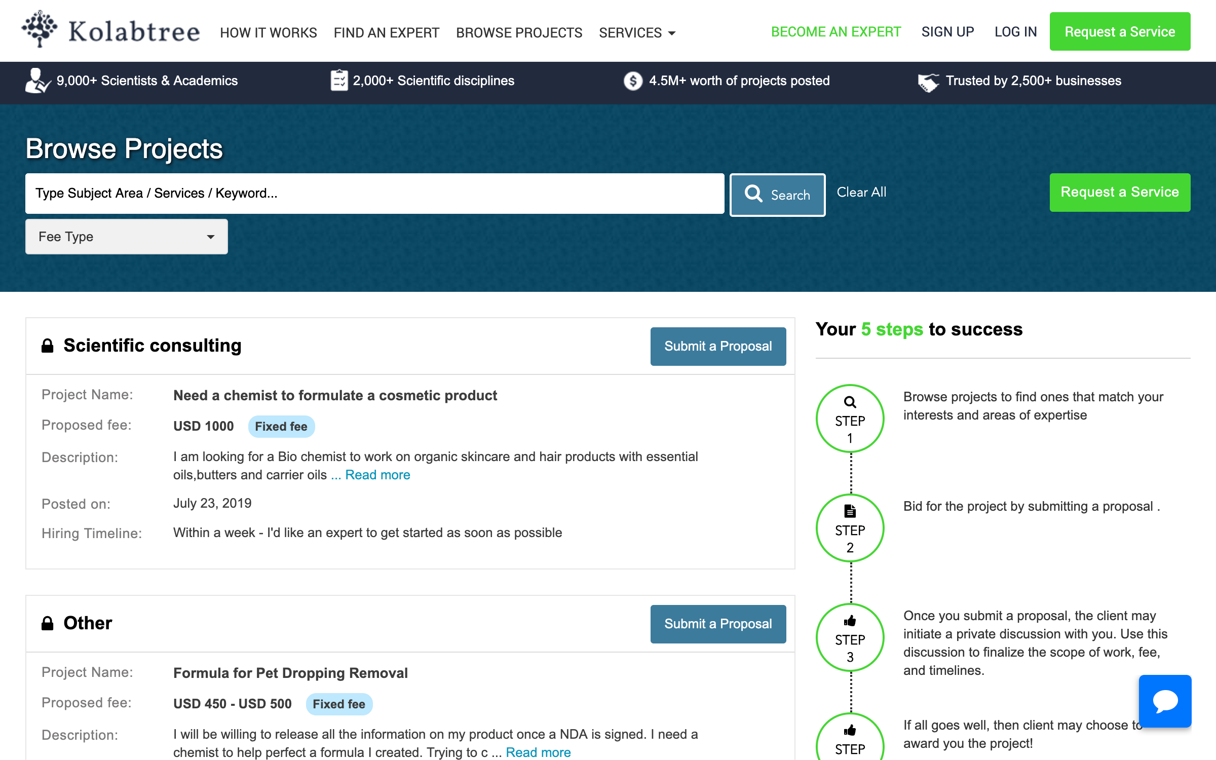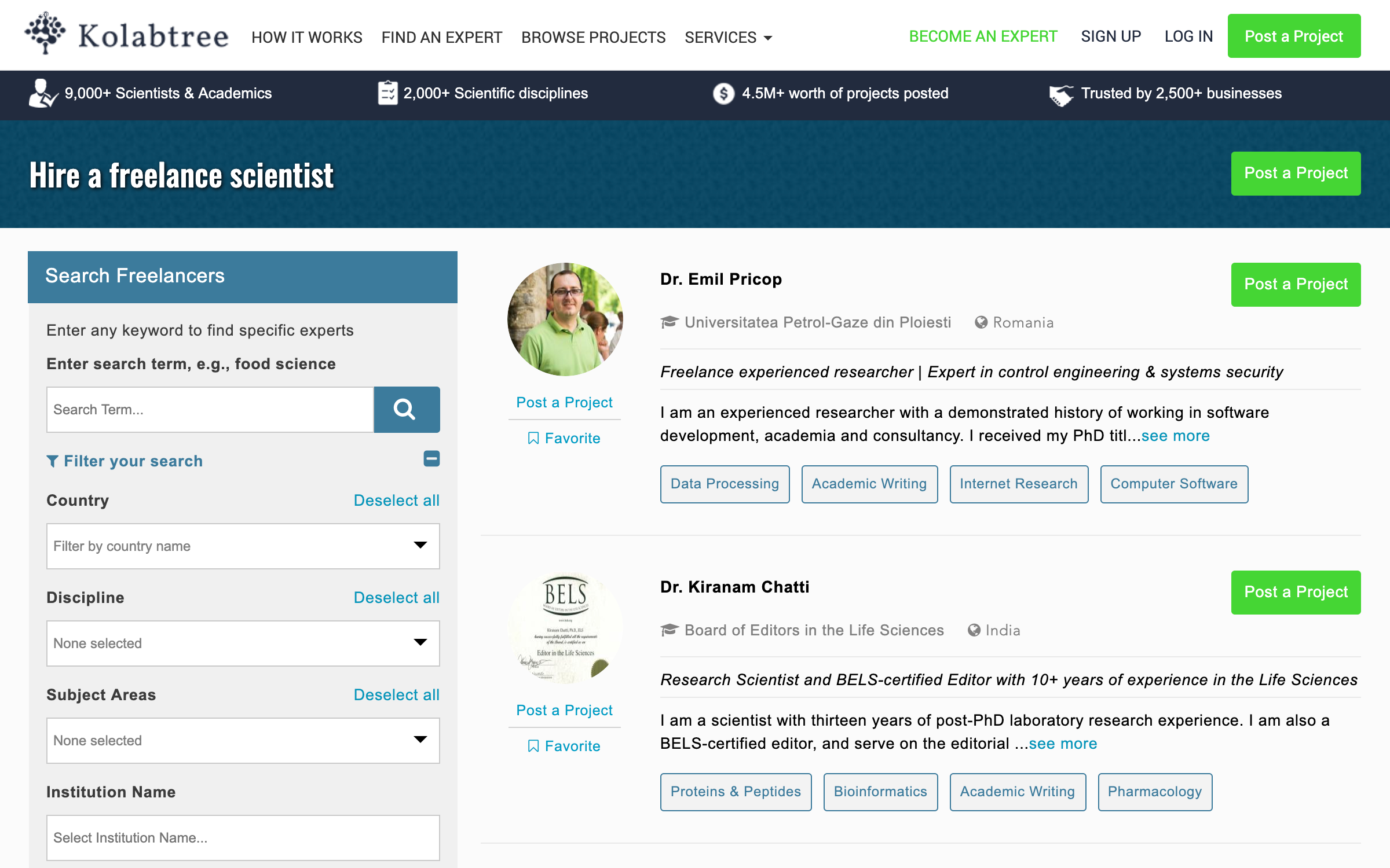 The world’s largest platform for freelance scientists. Kolabtree connects you to an exclusive network of top scientists and researchers from all over the world. Post your project, browse experts, and get your job done quickly and easily.
