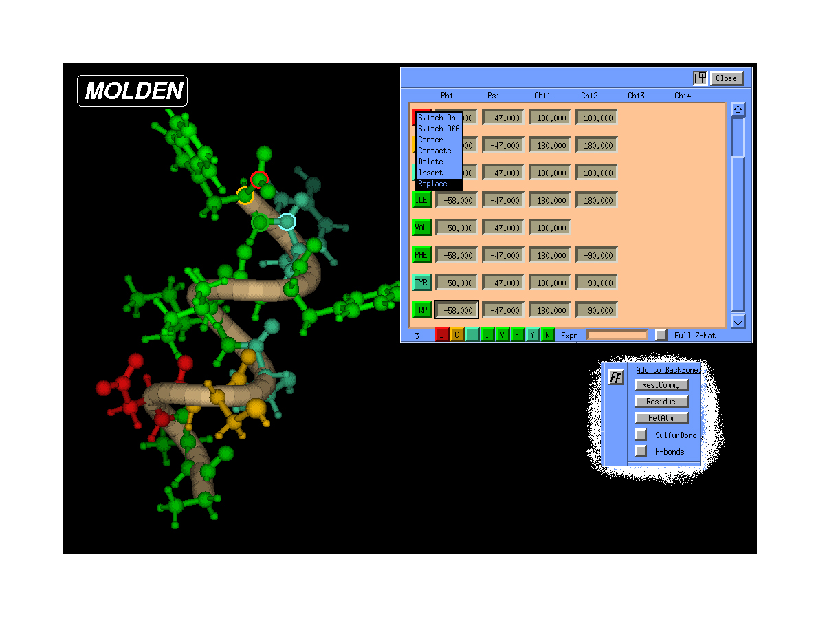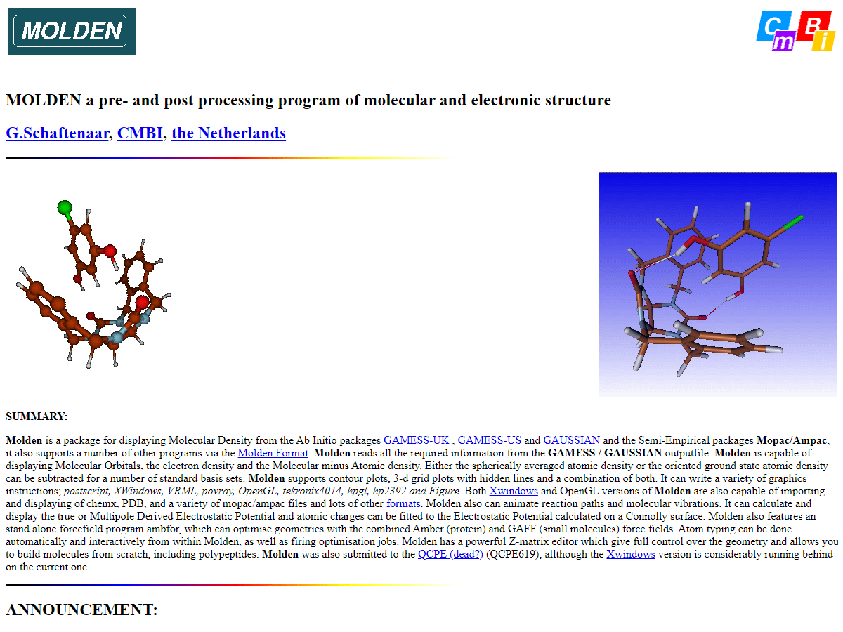 Molden is a package for displaying Molecular Density from the Ab Initio packages GAMESS-UK , GAMESS-US and GAUSSIAN and the Semi-Empirical packages Mopac/Ampac, it also supports a number of other programs via the Molden Format. Molden reads all the required information from the GAMESS / GAUSSIAN outputfile. Molden is capable of displaying Molecular Orbitals, the electron density, and the Molecular minus Atomic density. Either the spherically averaged atomic density or the oriented ground state atomic density can be subtracted for a number of standard basis sets. Molden supports contour plots, 3-d grid plots with hidden lines and a combination of both.