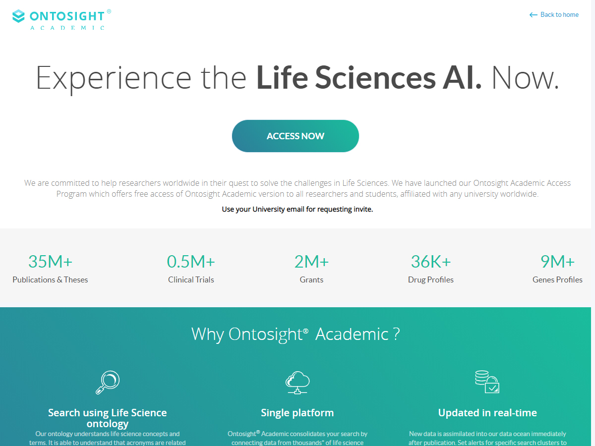 Ontosight® is an end-to-end search and discovery platform developed by Innoplexus which is a life science intelligence engine that allows users to query the biomedical ontology and retrieve data assets closely associated with the user's search term. This concept-based approach is made possible through the mapping of causal relationships between biomedical terms and concepts, allowing the platform to make logical jumps to other closely related concepts in the ontology. Users can create real-time custom dashboards for a variety of user-defined use cases relevant across the drug development process. Ontosight was rebranded in 2018 from iPlexus. As of 2019, Innoplexus has made a version of Ontosight available for free to academic researchers with a .org or .edu email address.