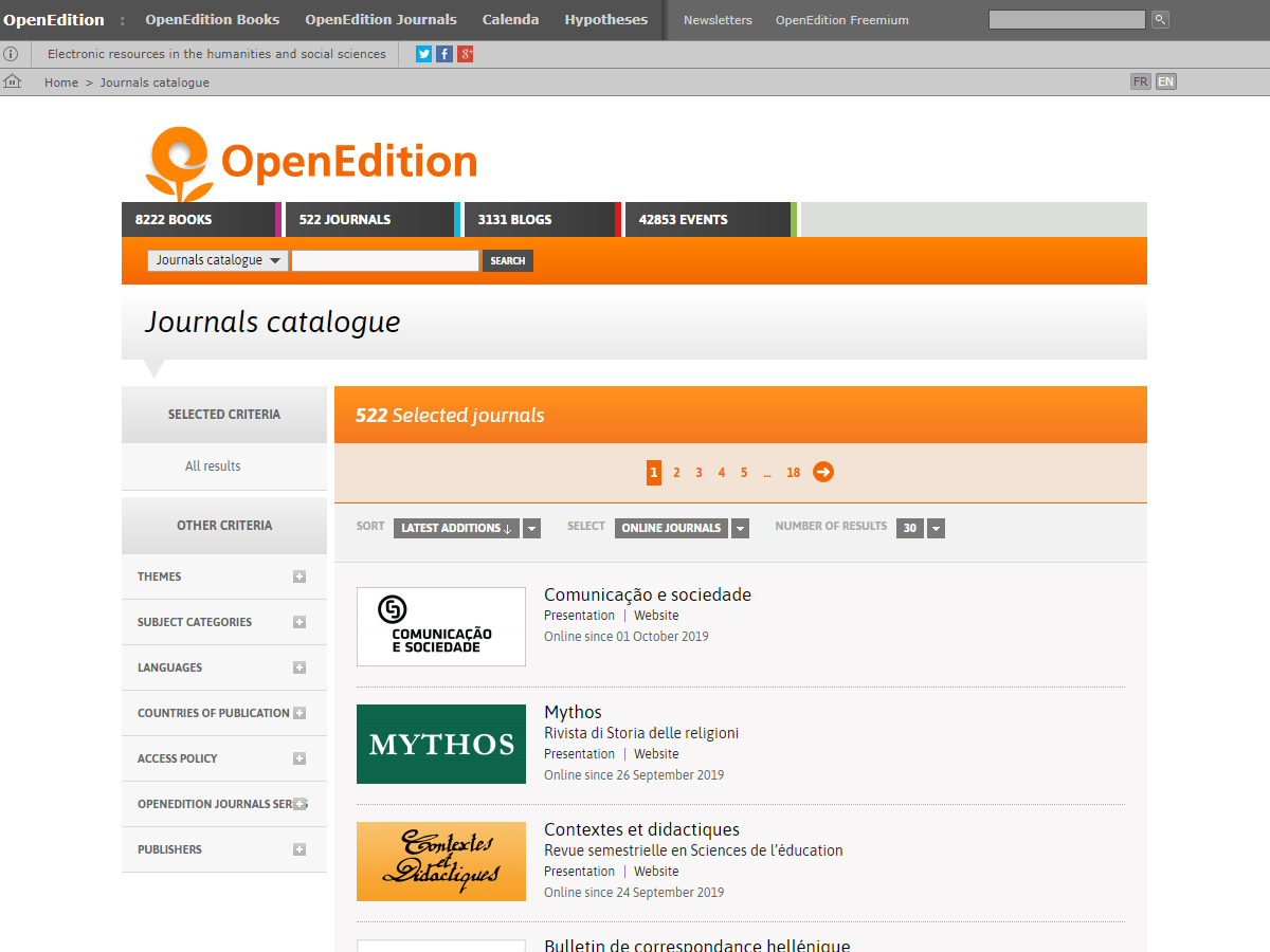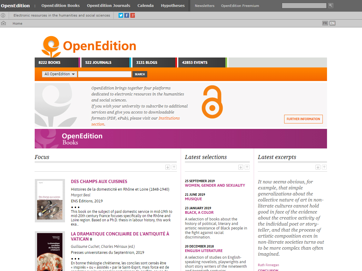 The OpenEdition portal includes four publishing and information platforms in humanities and social sciences: OpenEdition Journals, OpenEdition Books, Hypotheses (research blogs) and Calenda (announcements of international academic events). The portal is a space dedicated to the promotion of research and publication of tens of thousands of scientific documents that promote open access, while respecting the economic equilibrium of publications. OpenEdition was awarded the “Investments for the Future” label in 2012. Its main missions are the development of open access digital publishing, the dissemination of uses and skills related to digital publishing, research and innovation around enhancement methods, and digital-driven information retrieval.