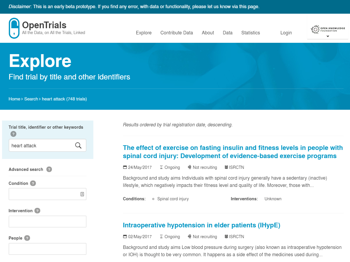 OpenTrials is a collaboration between Ben Goldacre and the tech team at Open Knowledge International. The documents and data relating to a clinical trial can be spread across the internet, in journal articles, registries, regulator archives, and more. This makes it hard to spot what’s missing, and hard to spot discrepancies. OpenTrials aims to thread together all the publicly accessible documents and data, on all clinical trials, in an open database populated through record linkage, ID matching, and crowdsourcing.