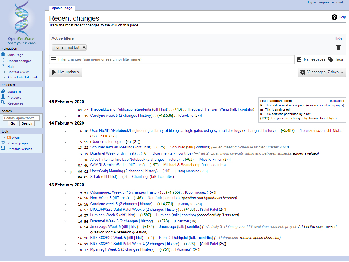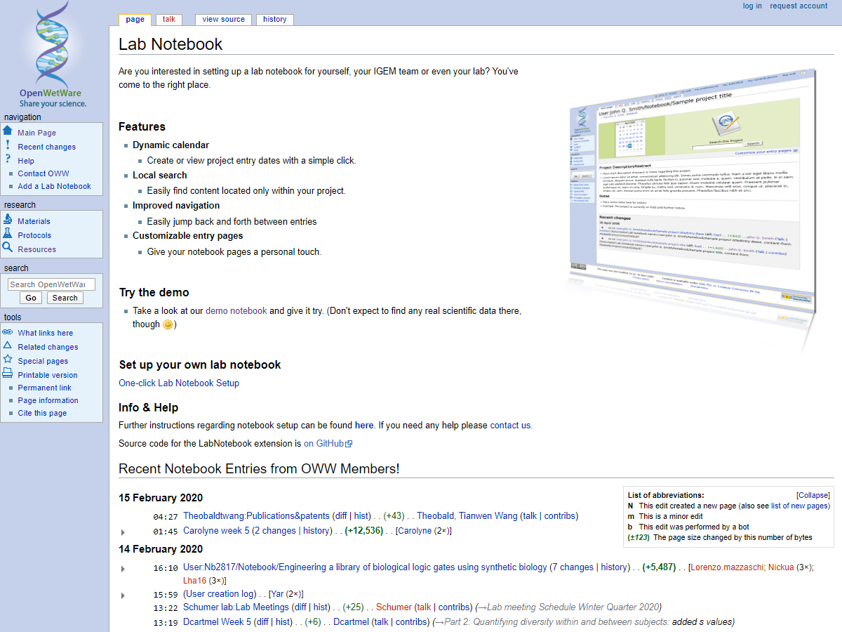 OpenWetWare is a wiki (an application designed to make it easy to create, edit and organize Web pages) for biological science and engineering. It basically provides a common space for people to share information about protocols, materials, research projects, meetings or anything else that might be of interest to users. Allows sharing expertise, information, and ideas in biological science and engineering. OpenWetWare is a wiki that stores labs and groups, classes and protocols. Users can keep an online lab notebook, host their course or lab website and also find and share laboratory protocols.
