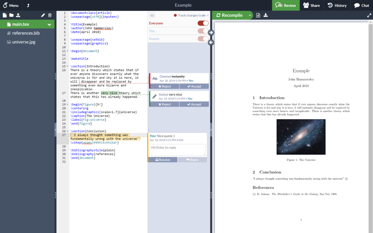 The easy to use, online, collaborative LaTeX editor. There's nothing complicated or difficult for you to install, and you can start using LaTeX right now, even if you've never seen it before. Overleaf comes with a complete, ready to go LaTeX environment which runs on our servers.