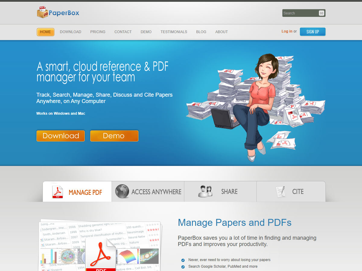A cloud-based tool that allows you to manage papers and PDFs and access them anywhere (Windows, Mac, and Linux). It also makes it easy to share with friends and collaborators. We hope PaperBox will make your work more productive.