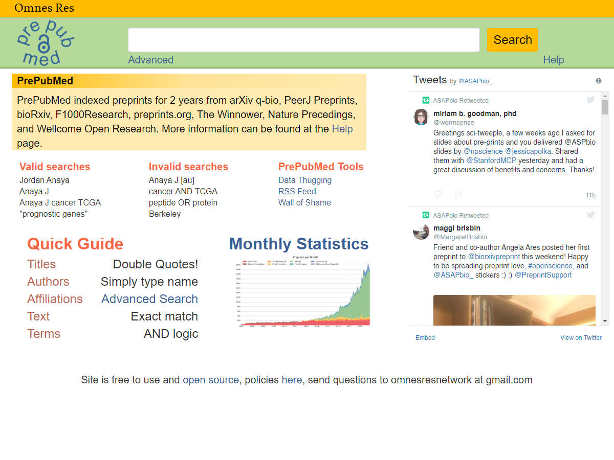 PrePubMed is a platform that indeTypingxes published preprints. PrePubMed indexes tens of thousands of articles from the preprint servers arXiv q-bio, PeerJ Preprints, bioRxiv, preprints.org, and Nature Precedings, as well as articles from F1000Research and Wellcome Open Research. PrePubMed search results provide the preprint title, author, publish date, and author affiliations, along with a link to the preprint. Search results are organized by date with the most recent articles appearing at the top of the list.