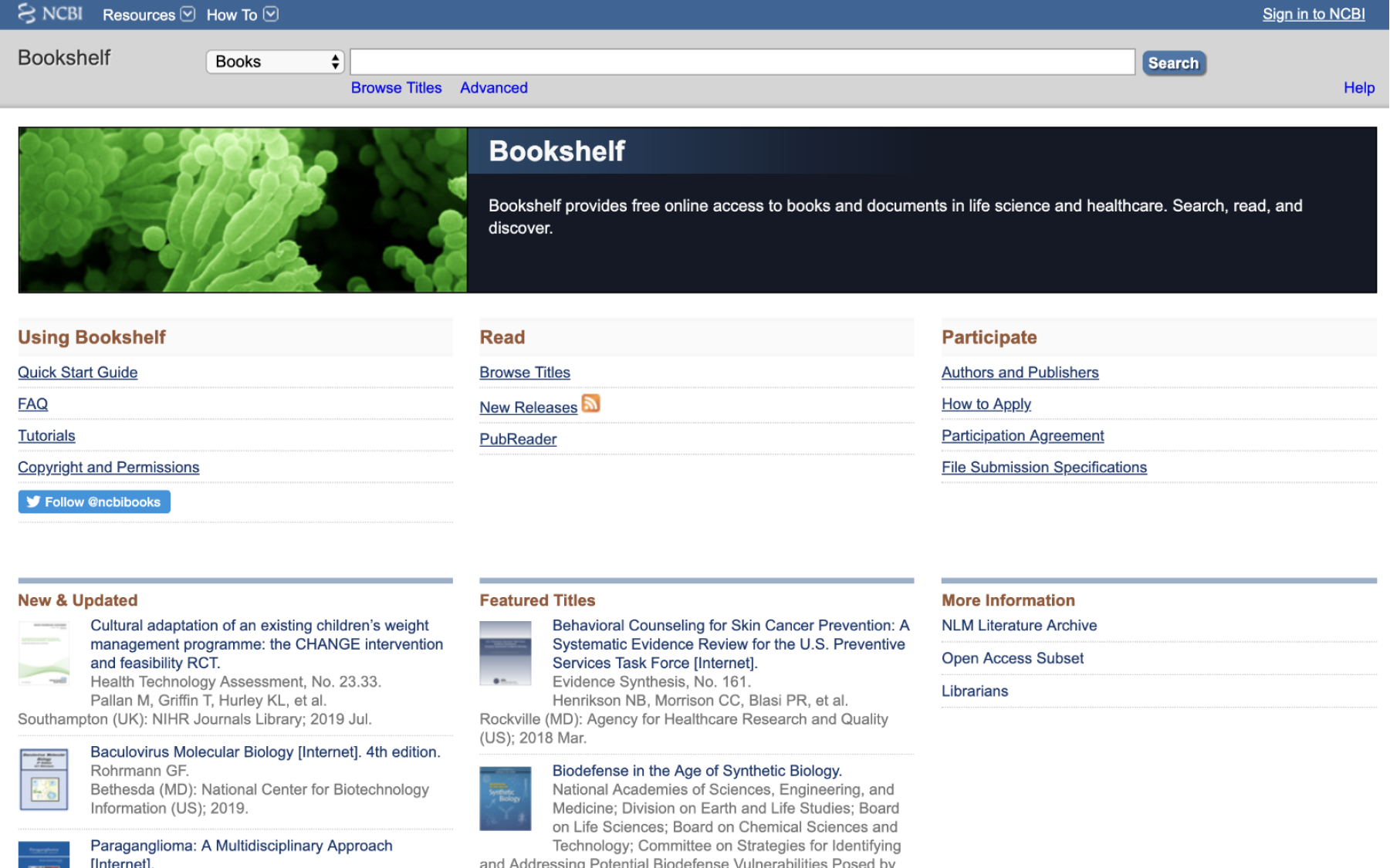 a collection of books available full-text and other subsets of NLM records, PMC citations, NCBI Bookshelf,