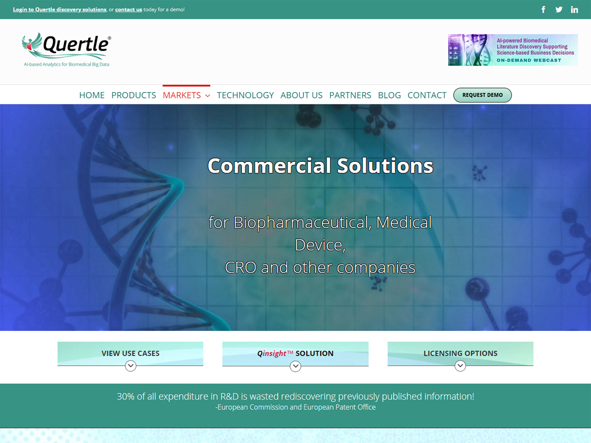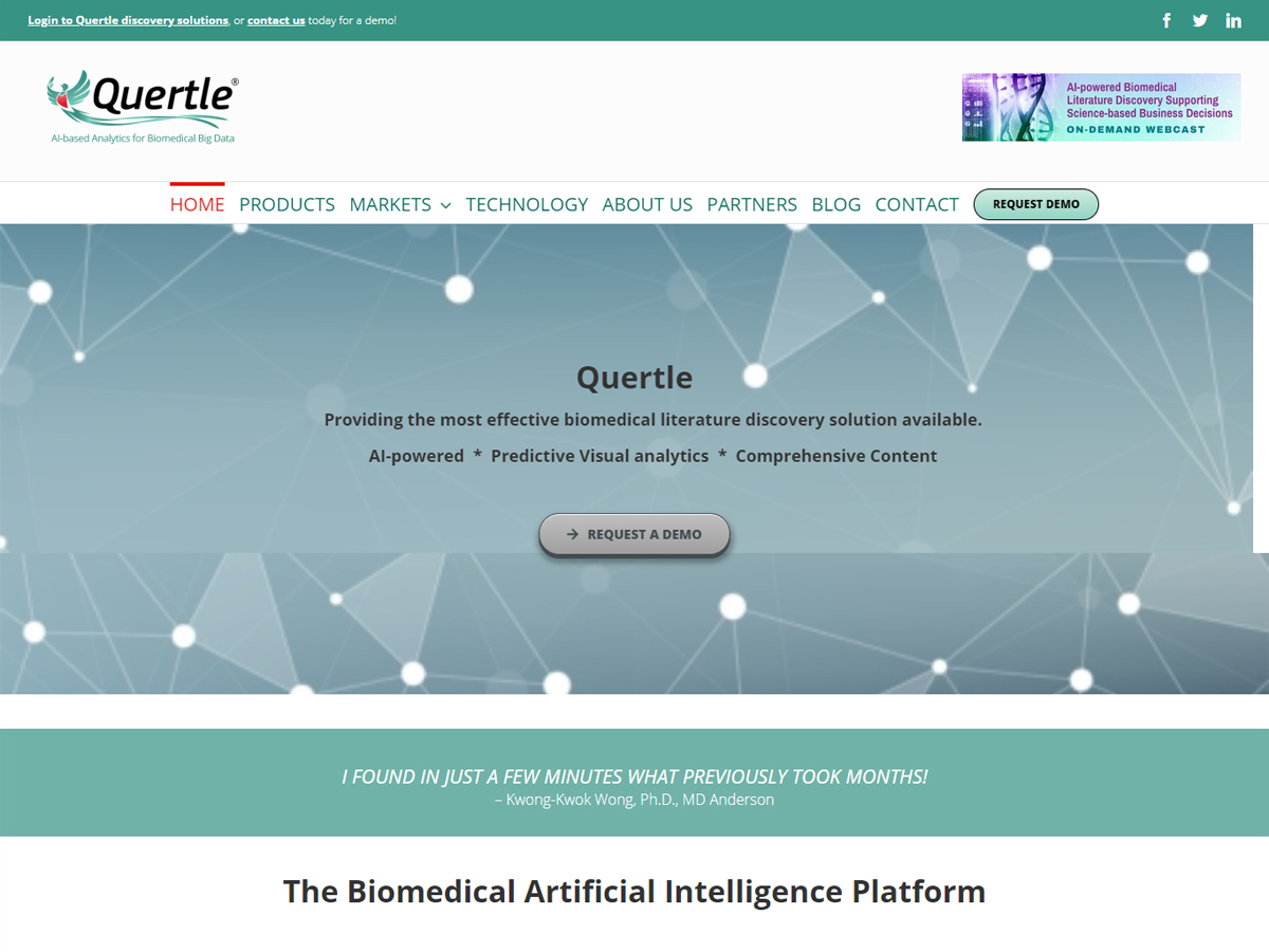 Quertle’s flagship product is its biomedical and life science search and discovery engine that applies the Quantum Logic Linguistics approach, in combination with a knowledge extraction-specific ontology (as compared to typical classification ontologies).