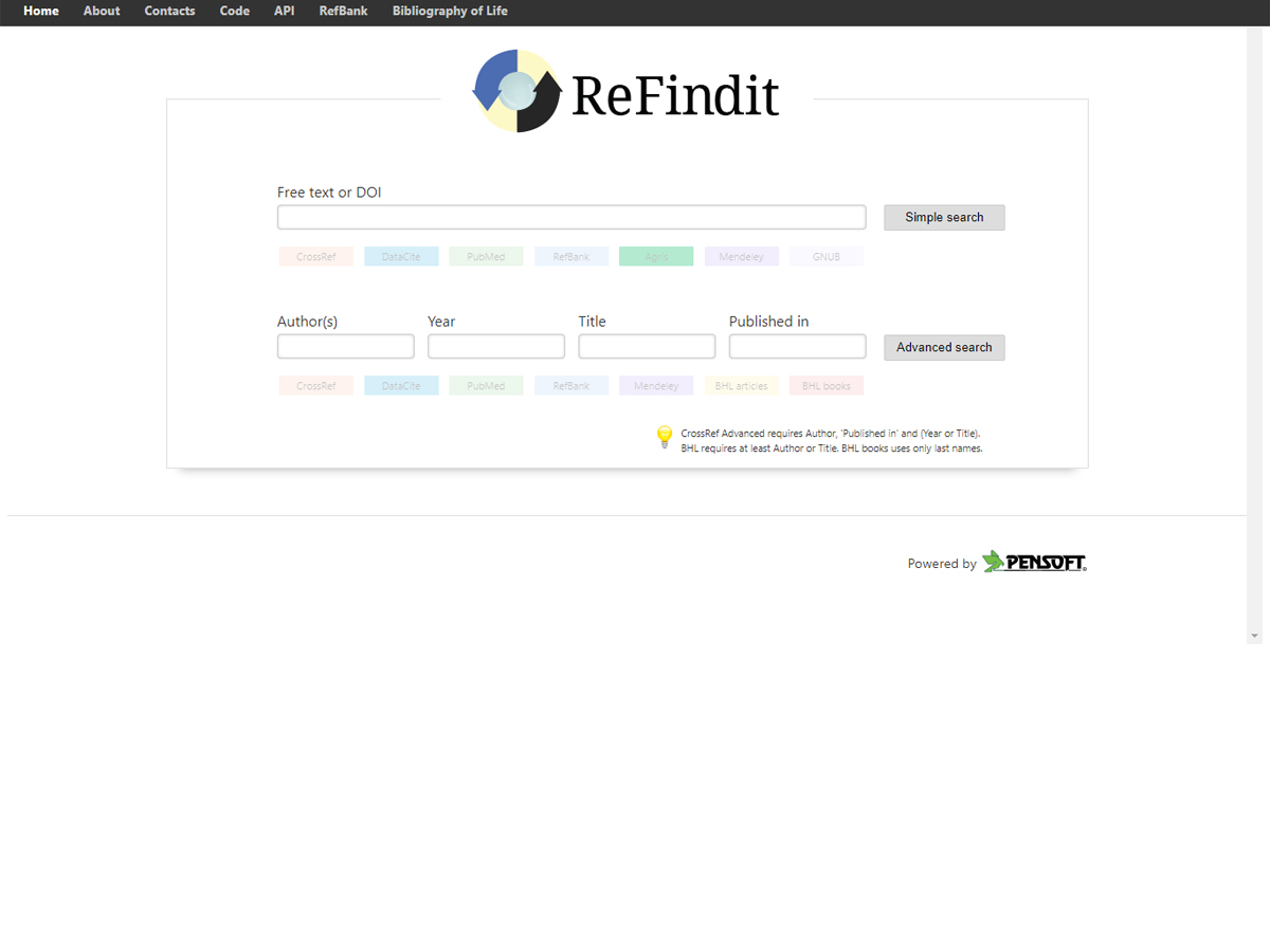 ReFindit has been developed by Pensoft, with the support of the ViBRANT project, funded by the Seventh Framework Programme of the European Union. It provides the search function across various data reference databases: CrossRef, DataCite, Agris, PubMed, Mendeley, RefBank, and GNUB. The search results are assembled and sorted out for the user to read or download, with the option to refine the search parameters. The searched references may be used for different purposes; for example, conversion to some 600 journal citation styles or for download in widely accepted bibliographic metadata standards. The tool is available as a standalone application at www.refindit.org and is also integrated as a search and download interface in the ARPHA Writing Tool (AWT) (https://arpha.pensoft.net).