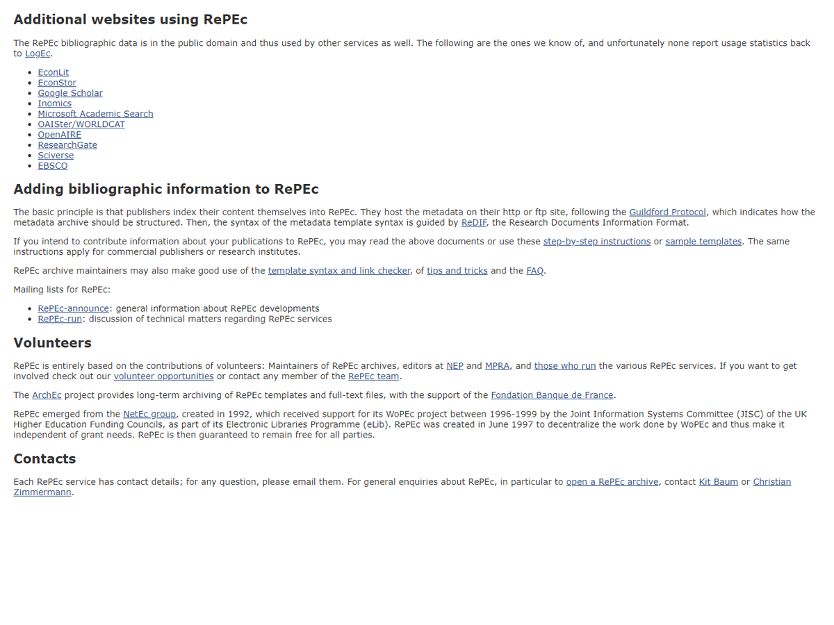 RePEc is sponsored by the Research Division of the Federal Reserve Bank of St. Louisa, and is a collaborative effort of hundreds of volunteers in 101 countries to enhance the dissemination of research in Economics and related sciences. The heart of the project is a decentralized bibliographic database of working papers, journal articles, books, book chapters, and software components; all maintained by volunteers. The collected data is then used in various services that serve the collected metadata to users or enhance it. Most contributions are freely downloadable, but the copyright remains with the author or copyright holder.