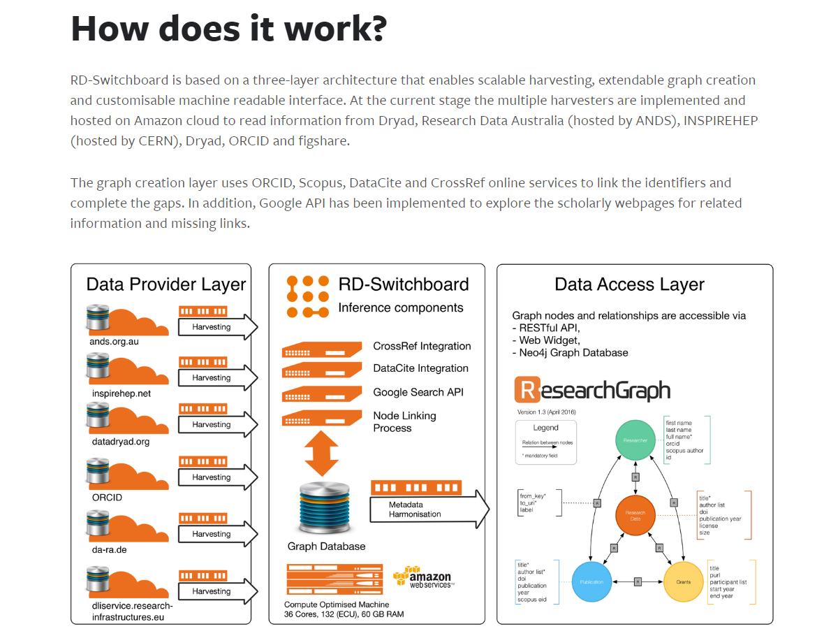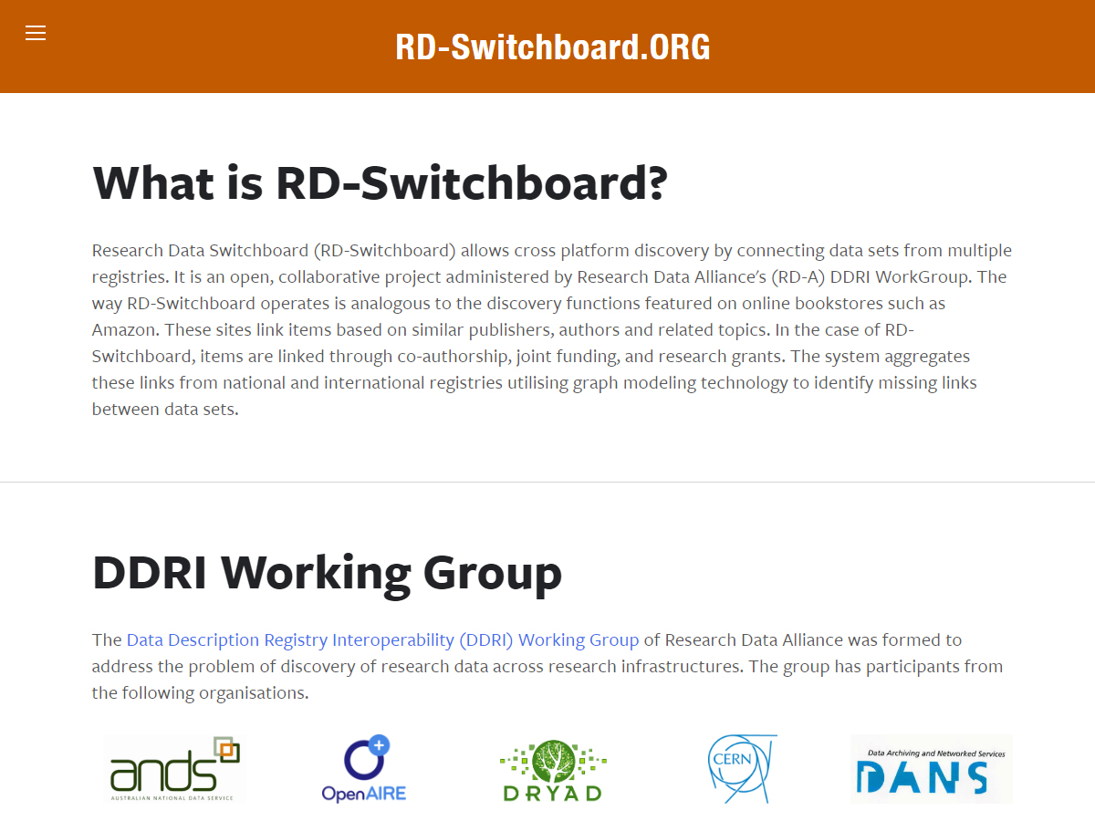 It is an open, collaborative project administered by Research Data Alliance's (RD-A) DDRI WorkGroup. The way RD-Switchboard operates is analogous to the discovery functions featured on online bookstores such as Amazon. These sites link items, based on similar publishers, authors, and related topics. In the case of RD-Switchboard, items are linked through co-authorship, joint funding, and research grants. The system aggregates these links from national and international registries, utilizing graph modeling technology to identify the missing links between data sets.