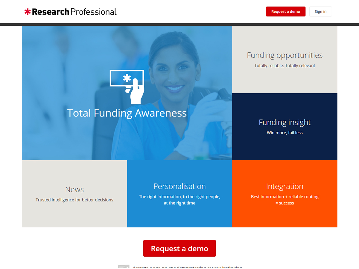 Using Research Professional’s extensive database of funding opportunities, as well as its comprehensive research funding news and analysis, institutions and researchers receive the information and guidance that they require to stay ahead of research developments and more effectively win grants.
