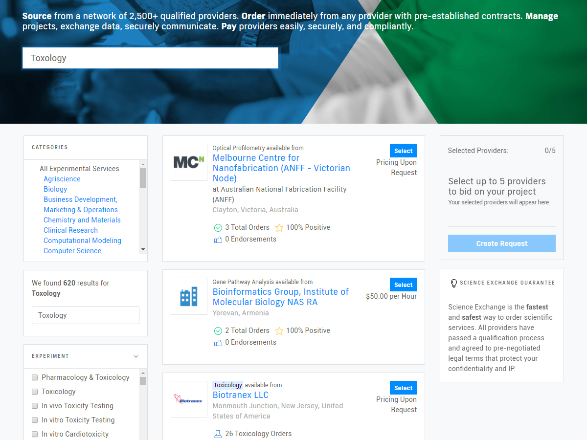 Science Exchange is a marketplace for scientific collaboration, where researchers can order experiments from the world's best labs. Science Exchange is the world’s leading R&D Services Management company, empowering research organizations to accelerate science and drive more innovation success. The Science Exchange Marketplace improves R&D productivity by automating many collaborative tasks between buyers and providers, such as obtaining quotes, managing projects and processing payments, all with rigorous data security and regulatory compliance embedded throughout. Founded by Elizabeth Iorns, Ryan Abbott and Dan Knox in Miami, FL in April 2011.