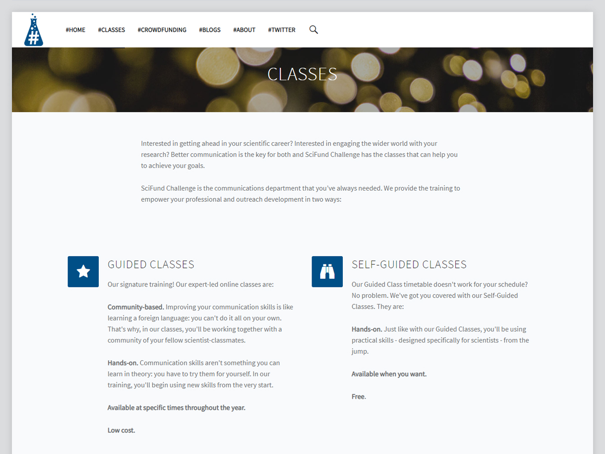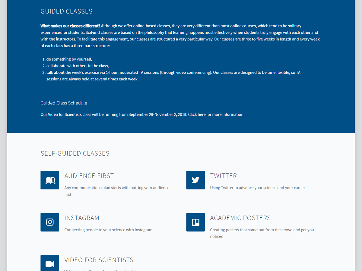 SciFund Challenge is a nonprofit, scientist-focused organization that empowers researchers to shrink the gap between science and society. They support scientists to connect to the wider world by training them how to engage the public with their science via online classes and training events. They offer free and low-cost online courses.