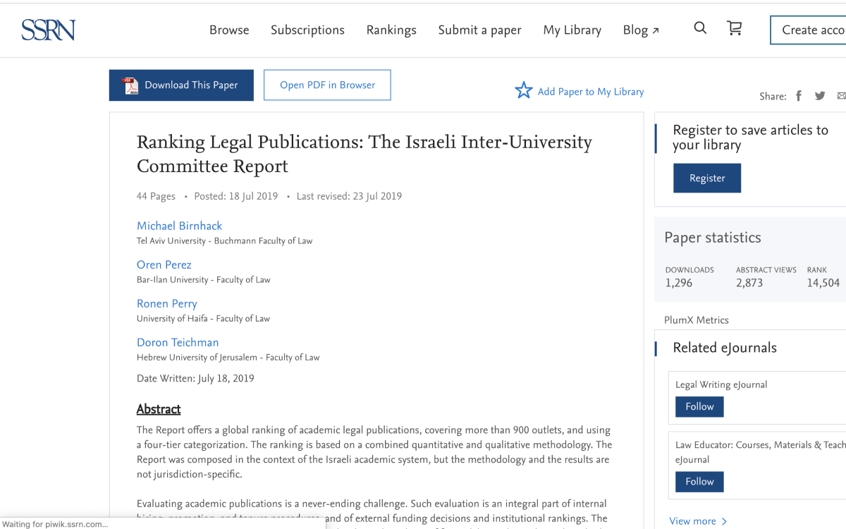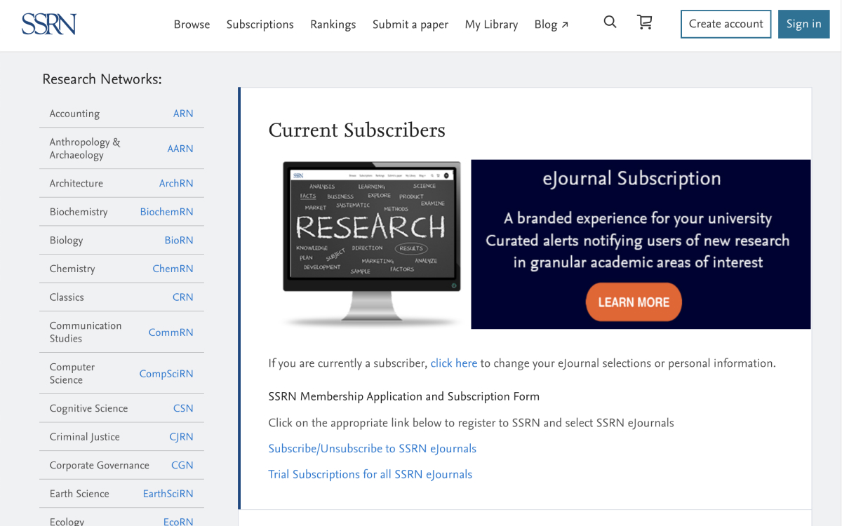 The SSRN, formerly known as Social Science Research Network, is a repository and international journal devoted to the rapid dissemination of scholarly research in the social sciences and humanities and more.