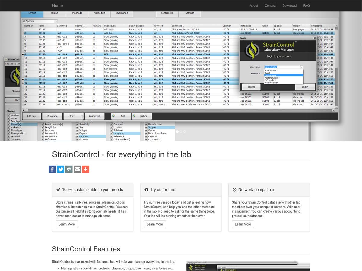 StrainControl Laboratory Manager is a windows-software for researcher to help organizing the lab. Keep track of strains, cell-lines, plasmids, oligos, antibodies, inventories, chemicals and more. StrainControl aims to help the user to manage everything in the laboratory. It permits to create database, share it on a network, create user accounts and manage associated rights, make links between files like protocols or images and the database. The user can customize all field titles to fit the laboratory needs.